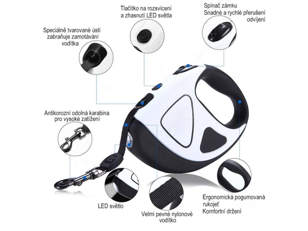 Komfortní a spolehlivé samonavíjecí ergonomické flexi vodítko s praktickým LED světlem. Velmi pohodlné a lehké vodítko vám zpříjemní i delší výlety. Výkonné světlo oceníte při pozdních večerních vycházkách, a především v zimních a podzimních měsících, kdy se brzy stmívá. Ať už potřebujete zkontrolovat psa, sebrat psí exkrement v trávě, najít klíče v kabelce nebo si posvítit na zámek - světlo rozsvítíte stisknutím tlačítka palcem velmi rychle, neboť vodítko stále držíte v ruce.