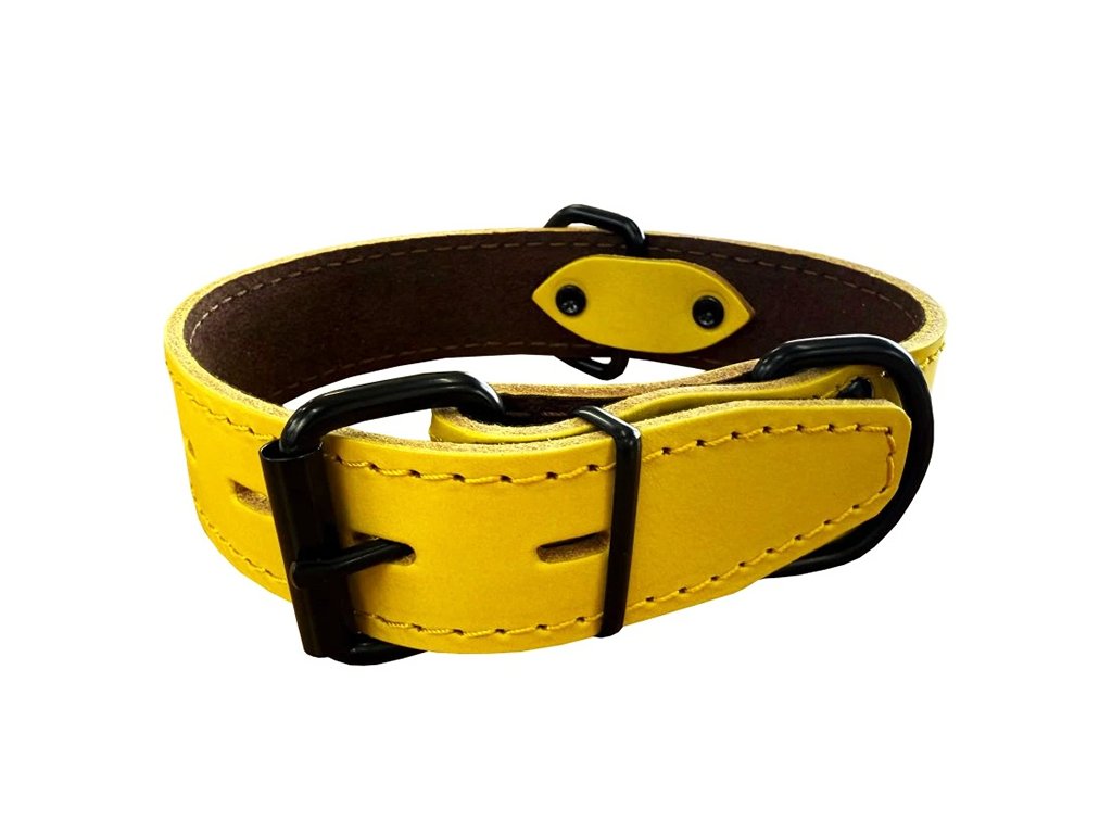 Kožený obojek žlutý s černým kováním, šíře 3,5-4 cm