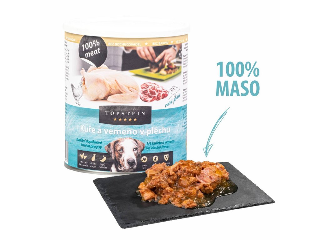 100% maso - Pes nebo kočka je především masožravec. Krmivo se 100% masem je jejich přirozená potrava a tak zaručuje nejvyšší kvalitu a biologickou hodnotu proteinů. To podporuje tvorbu svalů, dobrou kondici a vitalitu.