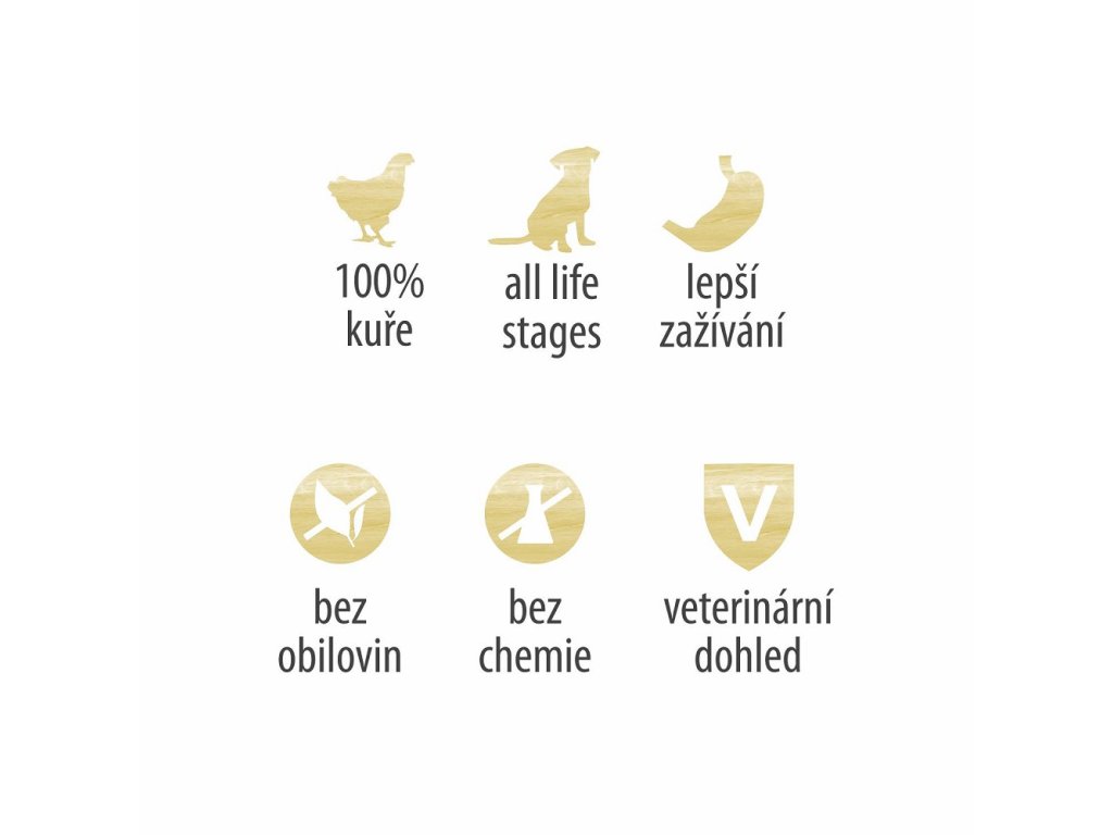 100% kuřecího masa s celou čtvrtkou kuřete. 100% podíl živočišných bílkovin.