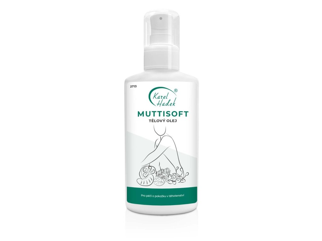 Tělový olej vhodný pro péči o pokožku v těhotenství při zvýšené tvorbě strií.