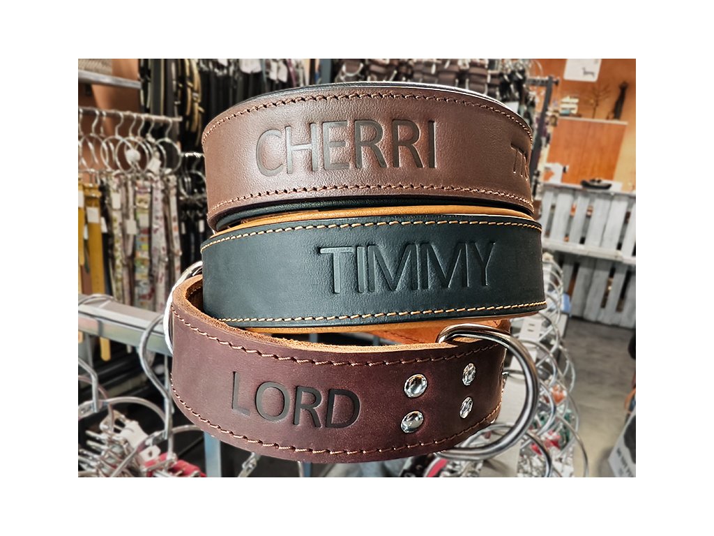 Embosovat text na obojek lze jednostranně (na jedné straně od středového očka) nebo oboustranně (od středového déčka vpravo a vlevo). Vždy pouze na lícové straně obojku. Font embosovaného textu viz fotografie Ragnar a Jule.