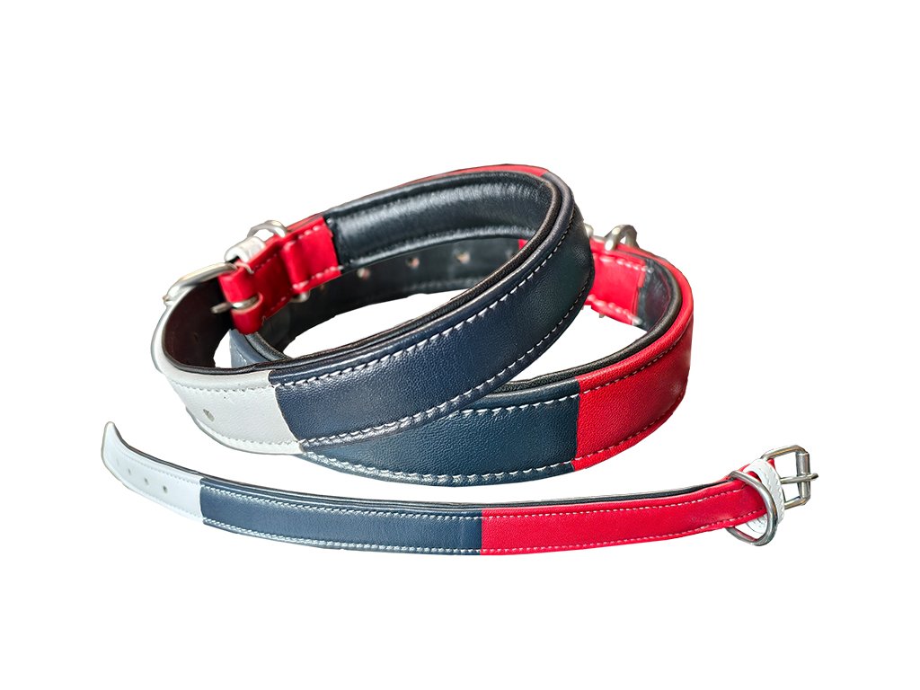 Kvalitní kožený a velmi pohodlný obojek z hovězí kůže v národních barvách, tj. červené, modré a bílé.